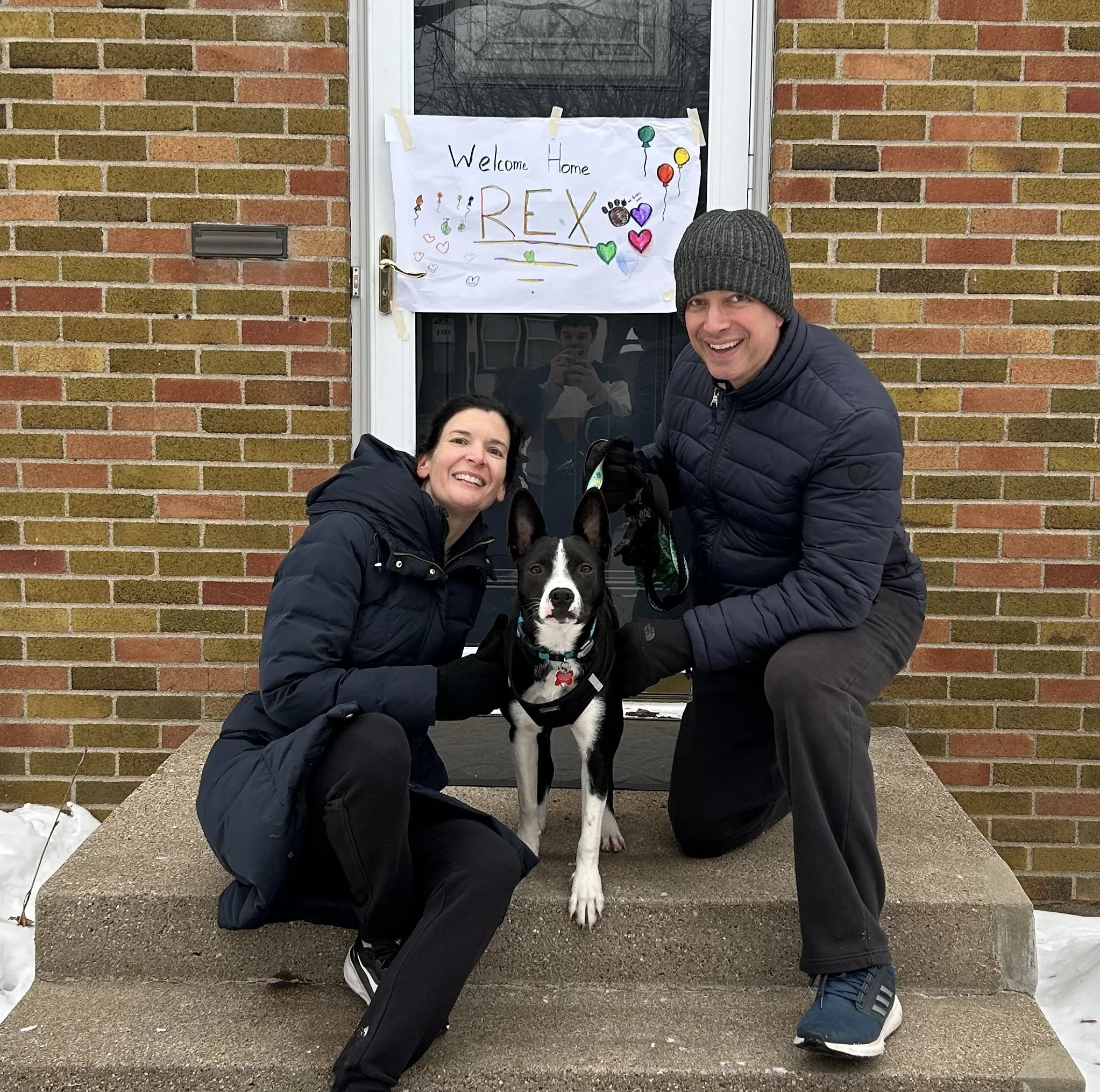 Our online search drew us to a wonderful dog named Rex. We had a Zoom meeting with his foster family, and Rex jumped up to greet us though the camera. Our hearts melted. What was not to love? Rex was incredibly cute, with deep brown eyes and extra special ears. We learned that Rex was playful and sweet, and loved other dogs. He was shy and took a little time to warm up to people, which was no big deal to us. His foster family thought he would be fine with a road trip home to Minnesota, and gave us the green light to adopt him.