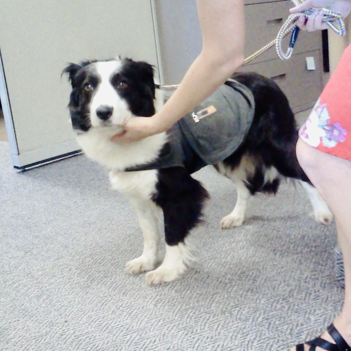 Photo at the top of the page: A big step - Vida left her kennel in the shelter basement and joined me in the office. She is wearing a Thundershirt which provides gentle compression to help dogs feel calmer.