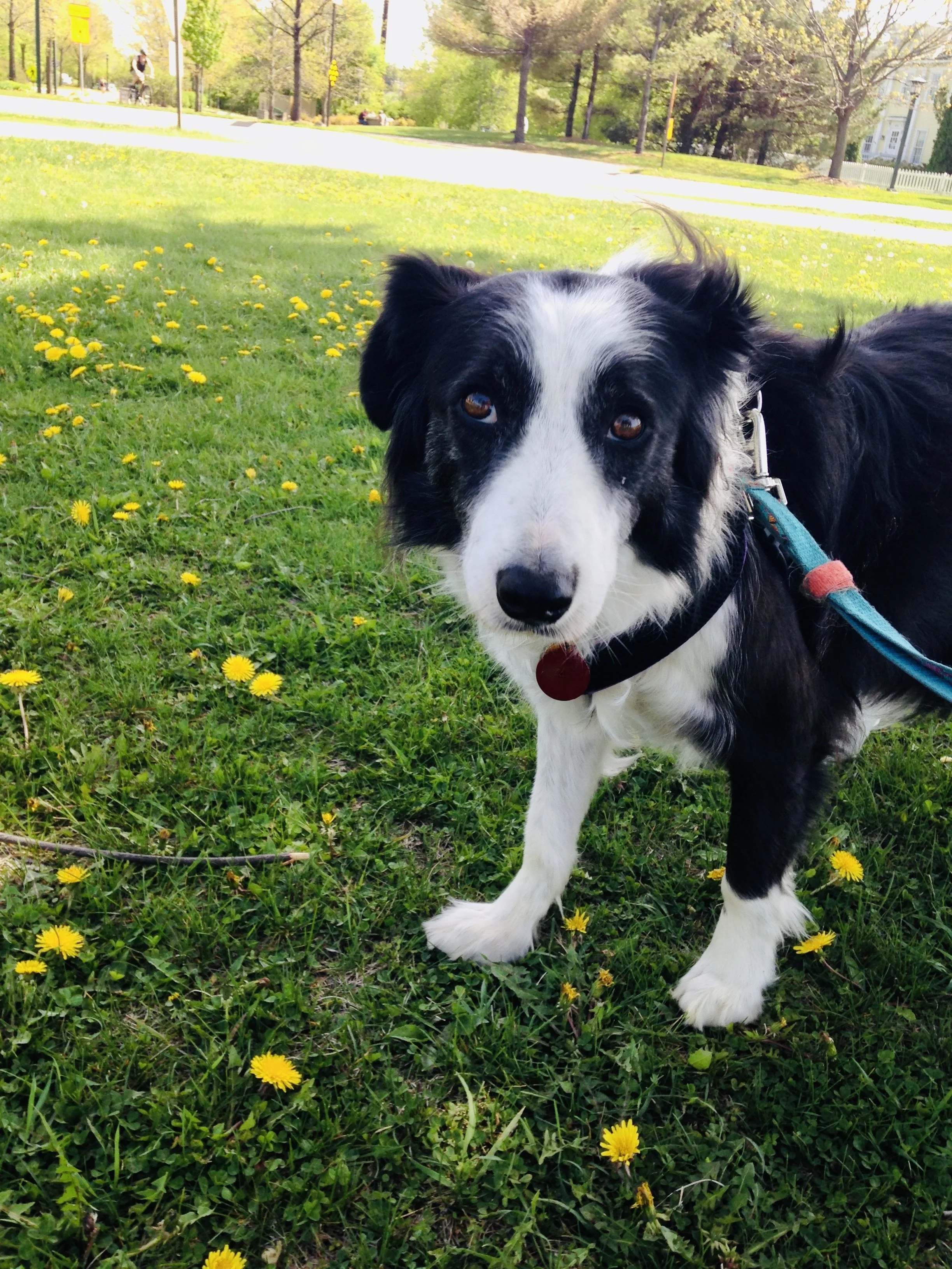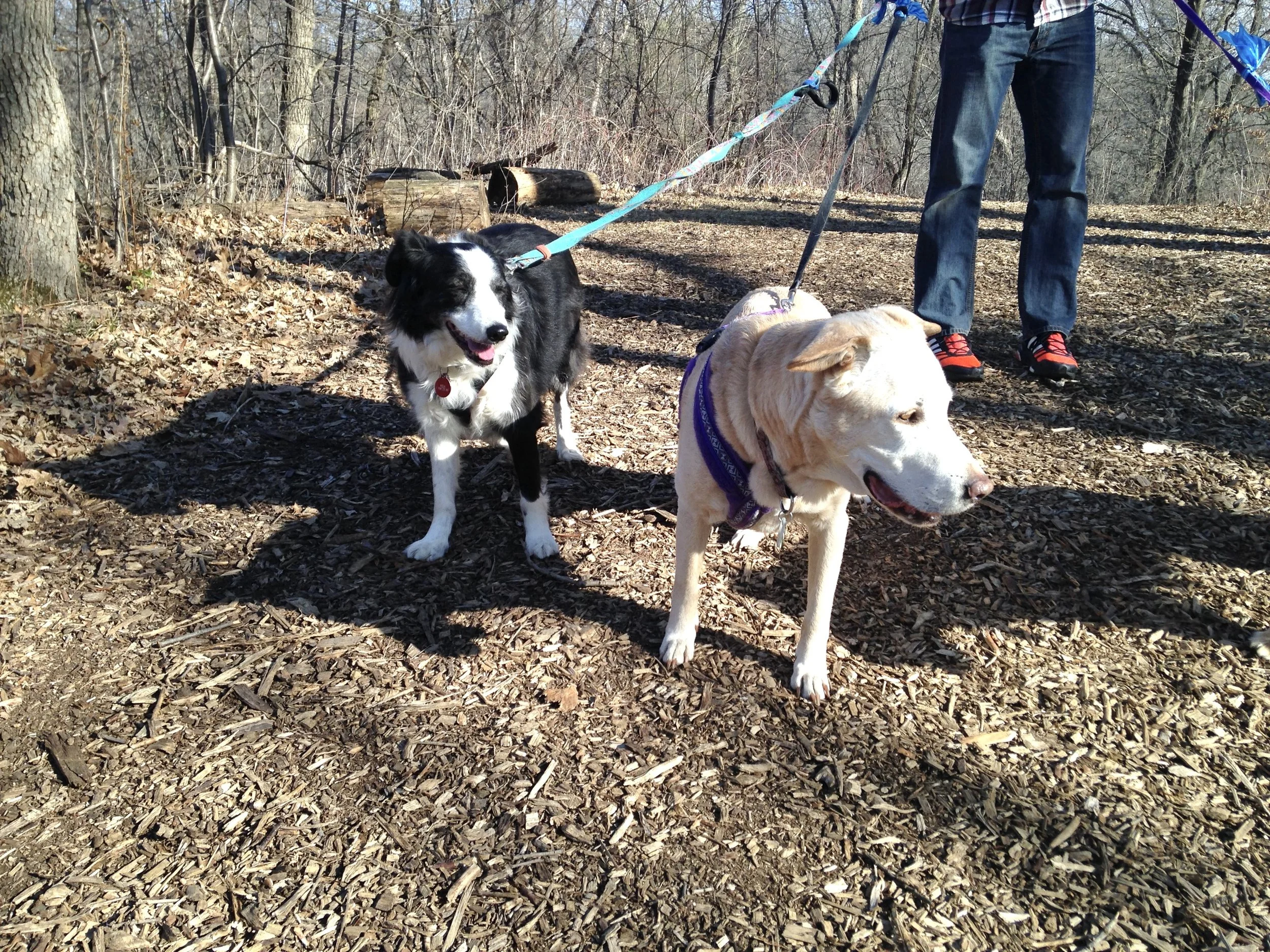 Exploring her new world after her rescue. Because she spooked easily, Vida wore two leashes for safety. She relied on mentor dogs to teach her normal dog behavior.